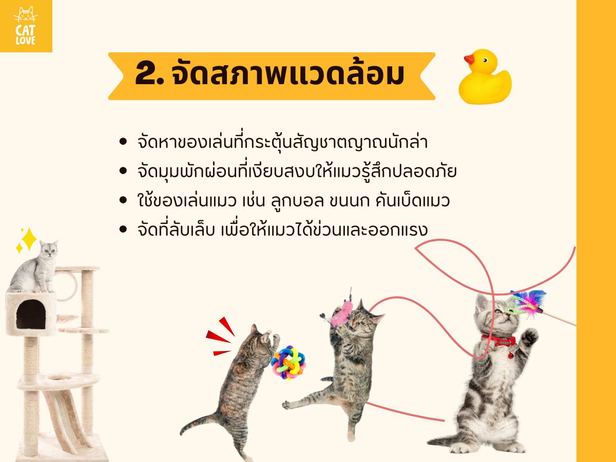 แมวเป็นสัตว์นักล่า การปล่อยให้พวกเขานอนเฉย ๆ ตลอดวันอาจทำให้เกิดภาวะอ้วนและโรคอื่น ๆ ได้ ลองจัดหาของเล่นที่กระตุ้นสัญชาตญาณนักล่า เช่น ของเล่นที่มีขนนก ลูกบอล หรือเลเซอร์ รวมถึงคอนโดแมวและที่ปีนป่าย เพื่อให้พวกเขามีพื้นที่ในการออกกำลังกายและสำรวจ