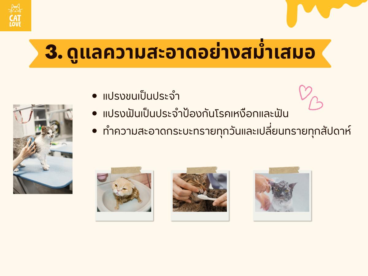 กระบะทราย: ทำความสะอาดกระบะทรายทุกวันและเปลี่ยนทรายทั้งหมดทุกสัปดาห์ เพื่อป้องกันการสะสมของเชื้อโรคและกลิ่นไม่พึงประสงค์