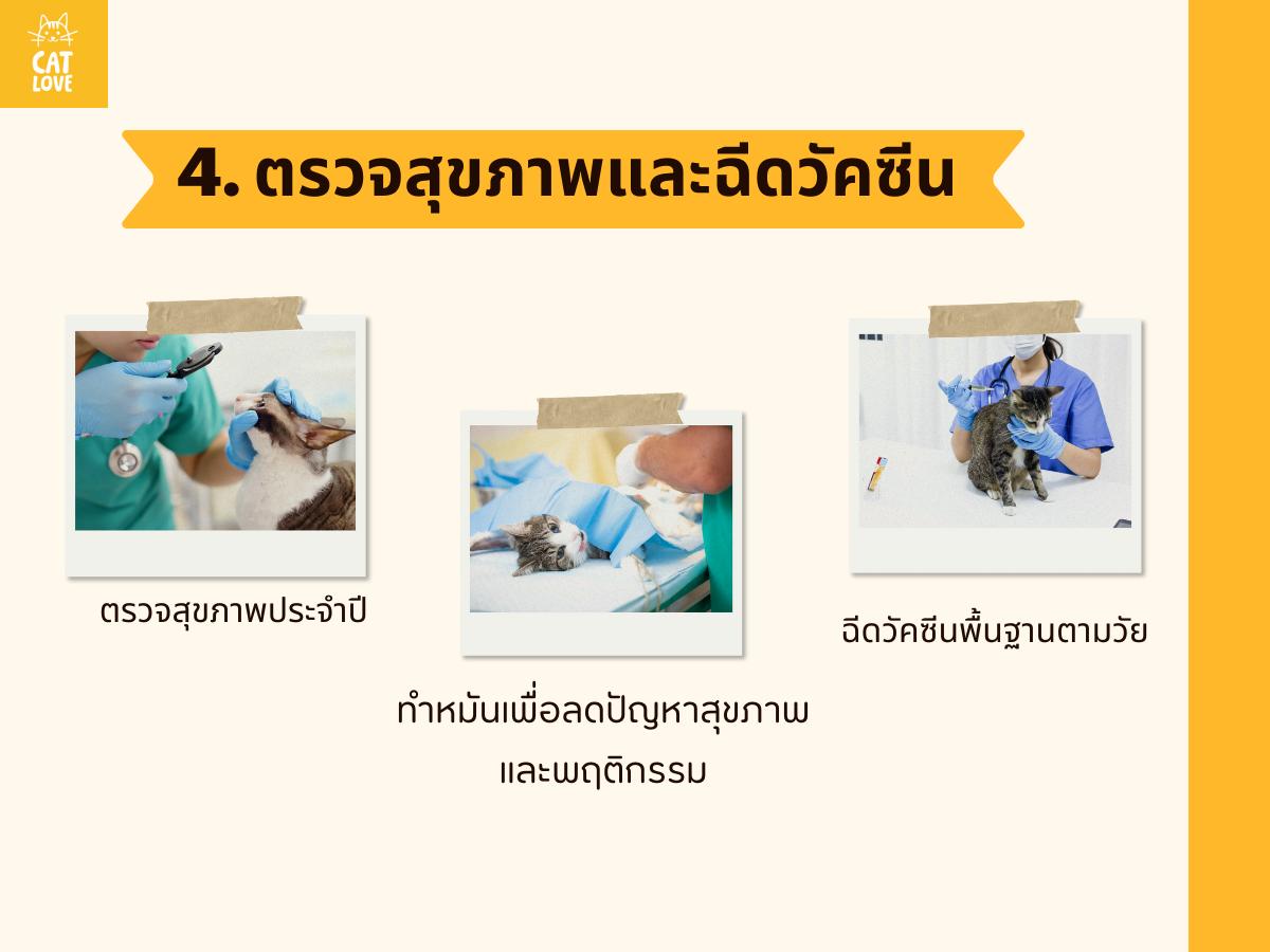 แม้ว่าแมวจะดูแข็งแรงดี แต่การพาไปตรวจสุขภาพประจำปีเป็นสิ่งสำคัญ การตรวจสุขภาพจะช่วยให้สัตวแพทย์ตรวจพบปัญหาสุขภาพตั้งแต่เนิ่น ๆ และทำการรักษาได้อย่างทันท่วงที รวมถึงการฉีดวัคซีนและป้องกันเห็บหมัดอย่างสม่ำเสมอ