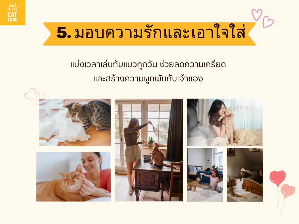 ความรักและความเอาใจใส่จากเจ้าของคือปัจจัยที่สำคัญที่สุดในการดูแลแมวให้มีความสุข ลองใช้เวลาเล่นกับพวกเขาอย่างสม่ำเสมอ ลูบหัว คลอเคลีย หรือแม้แต่พูดคุยด้วยน้ำเสียงที่อ่อนโยน ความผูกพันที่แน่นแฟ้นจะช่วยลดความเครียดและทำให้แมวมีสุขภาพจิตที่ดี
