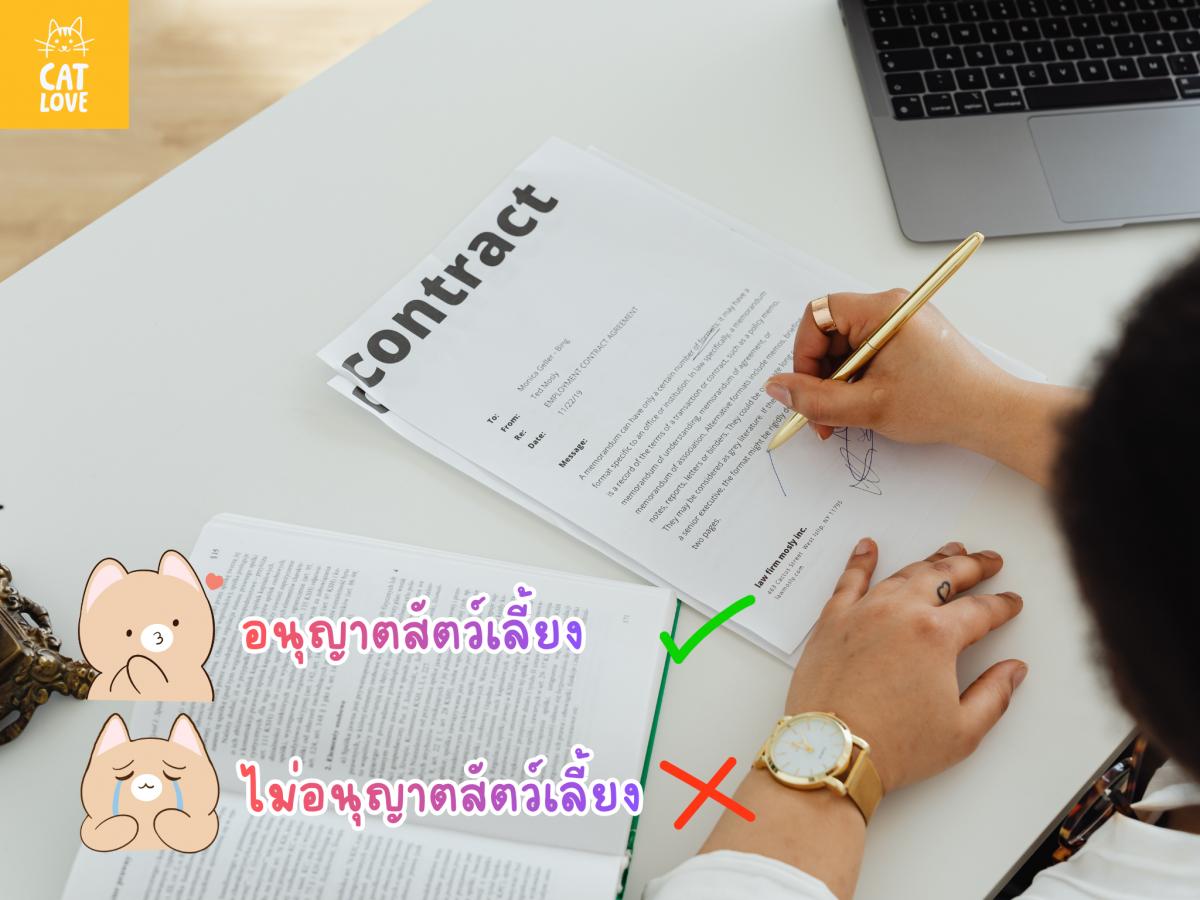 เช็คให้ชัวร์ ว่าคอนโดฯ หรือ อพาร์ตเมนต์ที่คุณอยู่ เป็นประเภท Pet-Friendly หรือ อนุญาตให้ผู้อาศัยเลี้ยงสัตว์เลี้ยงหรือไม่ หากไม่ใช่ อาจเป็นเรื่องไม่ดีที่จะนำสัตว์เลี้ยง หรือ น้องแมวเข้ามาเลี้ยง เพราะการต้องนำน้องเข้ามาหลบ ๆ ซ่อน ๆ อาจทำให้ทั้งตัวน้อง และตัวเราเป็นทุกข์มากกว่าที่จะมีความสุข แต่ถ้าเช็คในสัญญา หรือ รายละเอียดการเช่าเรียบร้อยแล้วว่าสามารถเลี้ยงสัตว์ได้ ก็ให้เดินหน้าเต็มที่ ไปที่ขั้นตอนการจัดเตรียมบรรยากาศและความพร้อมภายในคอนโดฯ ต่อไป ! (คอนโดฯ หรือ อพาร์ตเมนต์บางที่ จำเป็นต้องนำน้องไปลงทะเบียนกับนิติบุคคลด้วย อย่าลืมนำน้องไปรายงานตัวและลงทะเบียนกับนิติบุคคลคอนโดให้ถูกต้องด้วยนะ)