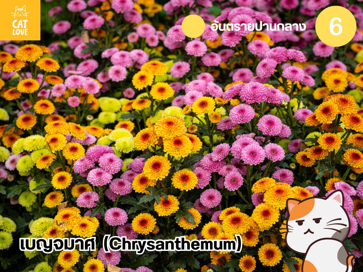 ดอกไม้ที่มีสวยงามอย่างเบญจมาศ ที่ดูไม่น่าจะมีพิษมีภัยต่อแมว แต่แท้จริงแล้ว เบญจมาศมีสารชนิดหนึ่งซึ่งออกฤทธิ์ต่อแมว นั้นคือ ไพรีทริน (Pyrethrins) และ เซสควิเทอร์พีน แลคโตน (Sesquiterpene lactones) สารพิษที่เรามักนำไปเป็นส่วนประกอบหนึ่งของยาฆ่าแมลงและศัตรูพืช ทำให้เมื่อแมวได้รับสารพิษทั้งสองชนิดเข้าไป แมวจะมีอาการน้ำลายไหลเนื่องจากเกิดการระคายเคืองในช่องปากและทางเดินอาหาร และในบางครั้งอาจมีอาการเดินเซ ทรงตัวไม่อยู่ และผดผื่นคันตามตัวร่วมด้วย อย่างไรก็ตาม ทั้งสองสารพิษไม่ได้ส่งผลร้ายแรงต่อแมวถึงชีวิตแต่อย่างใด เพียงแต่จะทำให้แมวแสดงอาการมึนงง เกิดอาการคันหรืออาการต่าง ๆ ที่คล้ายคลึงกับอาการแพ้ได้ แต่ถ้าได้รับในปริมาณมาก ก็อาจจะทำให้ไม่สบายหนักสักหน่อย ดังนั้น ทาสแมวต้องระวัง อย่าให้แมวเคี้ยวเบญจมาศเข้าไปล่ะ