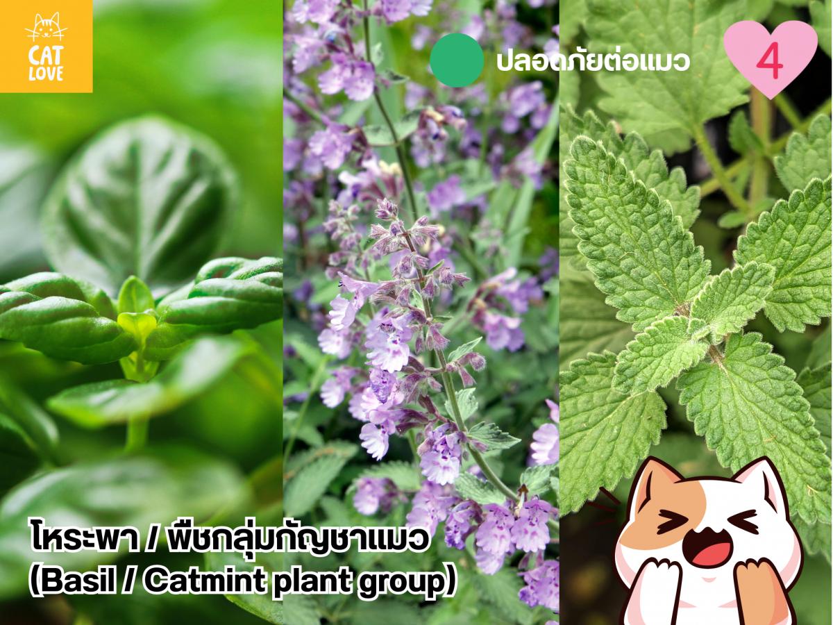 ทั้งโหระพาและพืชกลุ่มกัญชาแมวจัดเป็นพืชในสกุล Lamiaceae สกุลพืชจำพวกมินต์ พืชในสกุล Lamiaceae ไม่ได้มีสารใดที่ให้ความเป็นพิษต่อแมว แต่ลักษณะสำคัญของพืชในสกุลนี้ส่วนใหญ่ คือ มีกลิ่นฉุน ให้ฤทธิ์เย็นไปจนถึงแสบร้อน และประกอบไปด้วยน้ำมันหอมระเหย อย่างเช่น เปปเปอร์มินต์ และ สเปียร์มินต์ ทำให้พืชเหล่านี้เป็นพิษต่อแมวในทางอ้อม ที่อาจไม่ได้ส่งผลร้ายแรงต่อระบบอวัยวะภายใน แต่ก็ทำให้แมวเกิดอาการป่วย อาเจียน และไม่สบายตัวได้ แต่ถึงอย่างนั้นก็มีพืชบางชนิดในสกุล Lamiaceae ที่ไม่มีอันตรายต่อแมว อย่าง โหระพา และ พืชกลุ่มกัญชาแมว (กัญชาแมว (Catmint) และ แคทนิป) เนื่องจากพืชทั้ง 3 ชนิด ไม่ได้มีกลิ่นฉุนหรือมีน้ำมันหอมระเหยที่ให้กลิ่นรุนแรง ทั้งนี้ในโหระพายังอุดมไปด้วย วิตามิน A, C และ K และมีกากใยที่เป็นประโยชน์ต่อลำไส้ของแมว ทำให้แมวได้ประโยชน์ในทางอ้อมหากแมวกัดแทะใบโหระพาเข้าไป (แต่ระวัง : อย่าให้แมวกินโหระพาเยอะ เพราะมีฤทธิ์ทำให้เกิดอาการท้องไส้ปั่นป่วนได้) ส่วนพืชในกลุ่มกัญชาแมว ก็มีสารสำคัญอย่าง เนเพทาแลคโตน (Nepetalactone) ที่ส่งผลทำให้แมวรู้สึกผ่อนคลายและสบายใจ ช่วยคลายความกังวลของแมวทำให้แมว อีกทั้งดอกของพืชกลุ่มกัญชาแมวยังดูสวยงาม มีลักษณะคล้ายกับช่อของดอกลาเวนเดอร์ จึงเป็นอีกพืชชนิดหนึ่งที่เหมาะกับการนำมาปลูกประดับรอบบ้านที่เลี้ยงแมว