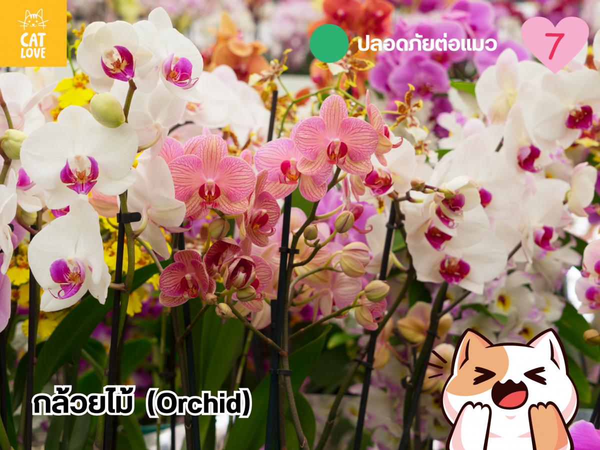 เช่นเดียวกับฮาโวเธีย กล้วยไม้เป็นพืชอวบน้ำที่มีส่วนต่าง ๆ ที่ค่อนข้างยืดหยุ่นและอ่อนนุ่มกว่าพืชอื่น ๆ ทั้งยังไม่มีองค์ประกอบที่ประกอบไปด้วยสารพิษ และแคลเซียมออกซาเลตแต่อย่างใด ทำให้มีความปลอดภัยต่อแมว ทั้งนี้กล้วยไม้ยังเป็นหนึ่งในตัวเลือกต้น ๆ ของไม้ดอกไม้ประดับที่นักแต่งบ้าน จัดส่วน ส่วนใหญ่เลือกกัน เพราะมีสีสันสวยงามและมีให้เลือกหลายสีหลายสายพันธุ์ เรียกได้ว่าเราสามารถเติมสีสันให้กับรอบบ้านได้อย่างไม่รู้จบได้เลยด้วยกล้วยไม้หลากชนิด !